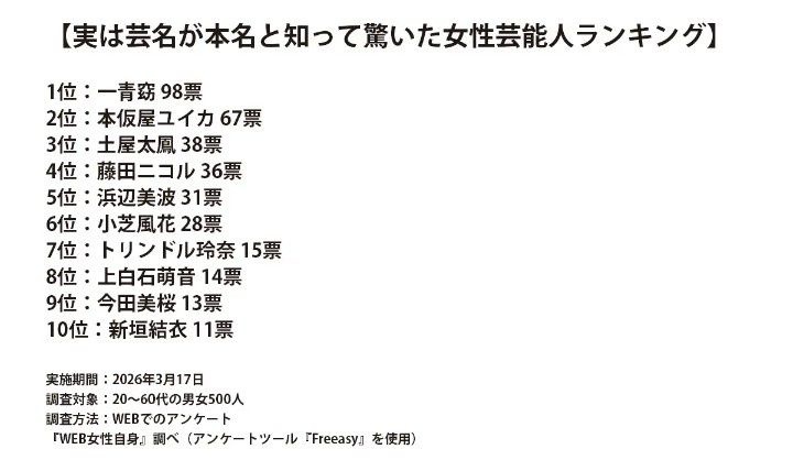 そこで本誌はWEBアンケートツール「Freeasy」にて、20~60代の男女500人を対象に「実は芸名が本名と知って驚いた女性芸能人」についてアンケート調査を実施した。