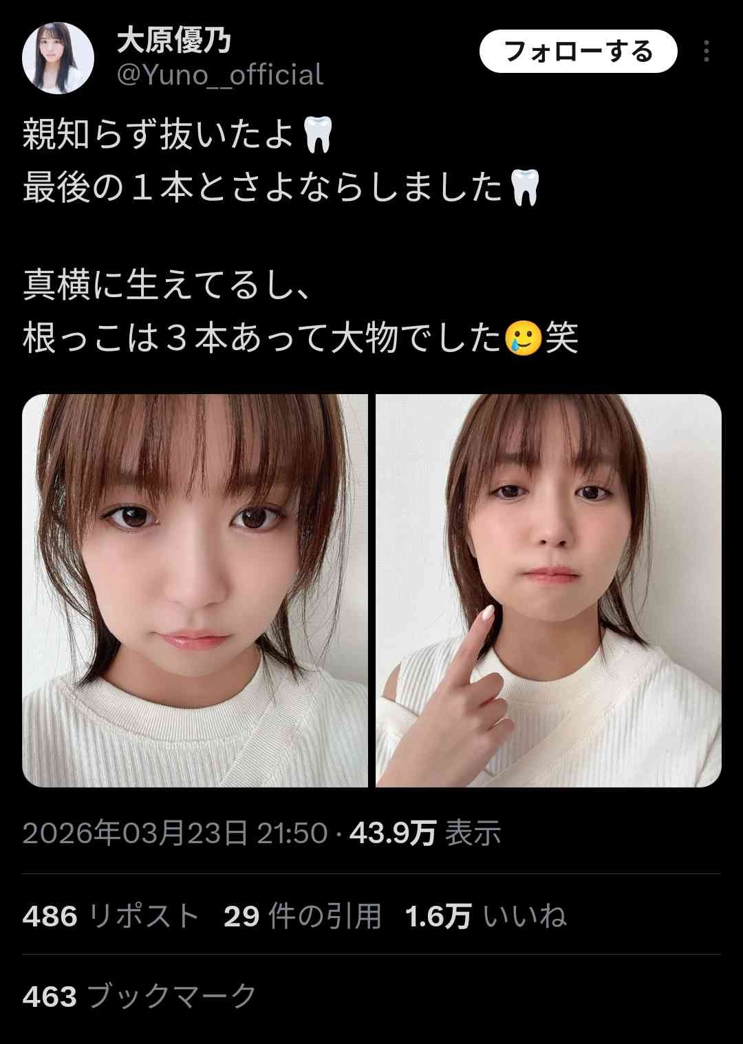 大原優乃、顔が大きく腫れた姿に心配の声「大丈夫ですか?」「かなり痛そう」