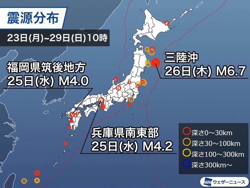 東北太平洋側や九州での地震が目立っています。震度3以上の地震は4回発生しました。(3月23日~29日10時の集計) 週刊地震情報 2026.3.29 今年最大規模のM6.7 三陸沖では昨年11月から活動が活発 - ウェザーニュース【週刊地震情報】26日(木)に三陸沖でM6.7の地震が発生し、最大震度4を観測しました。今年になってからは全国で最大規模の地震で、昨年11月から地震活動が活発な領域が震源です。weathernews.jp