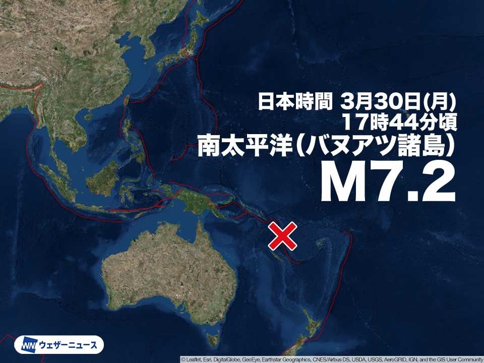 日本時間の3月30日(月)17時44分頃、海外で規模の大きな地震がありました。震源地は南太平洋(バヌアツ諸島)で、地震の規模(マグニチュード)は7.2と推定されます。