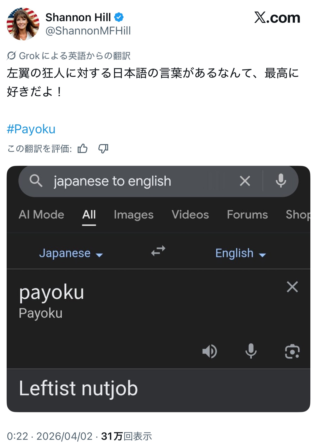 フォックス・コン (@yominokuni140) on X【悲報】左翼の蔑称「パヨク」、アメリカで「Payoku」として急速に広まり、世界共通語になってしまう。x.com