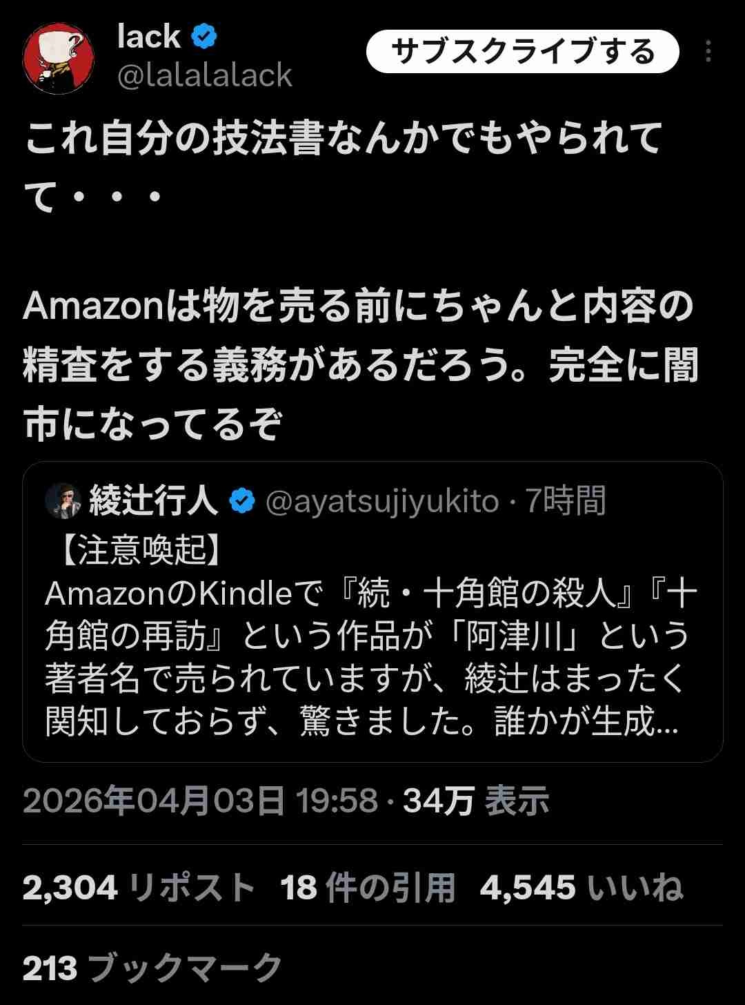 『十角館の殺人』『Another』など、多数の著書で知られるミステリー・ホラー作家の綾辻行人先生が、『十角館の殺人』の続編を連想させるタイトルがKindleで販売されているという注意喚起を自身のXで行いました。該当の作品には綾辻先生は一切関与しておらず、版元と共に対応を進めていることが明かされています。
