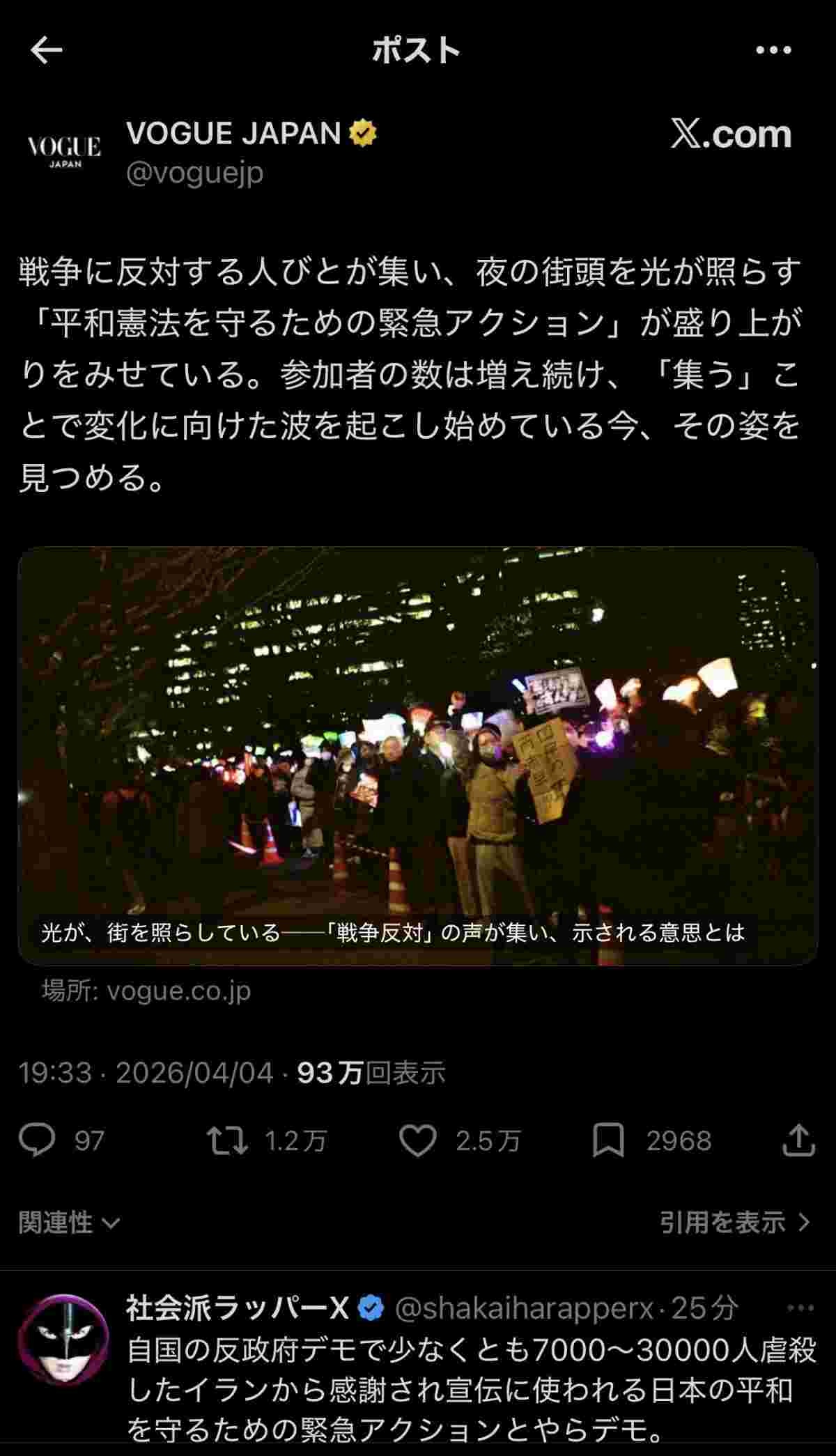 VOGUE JAPAN (@voguejp) on X戦争に反対する人びとが集い、夜の街頭を光が照らす「平和憲法を守るための緊急アクション」が盛り上がりをみせている。参加者の数は増え続け、「集う」ことで変化に向けた波を起こし始めている今、その姿を見つめる。x.com光が、街を照らしている──「戦争反対」の声が集い、示される意思とは