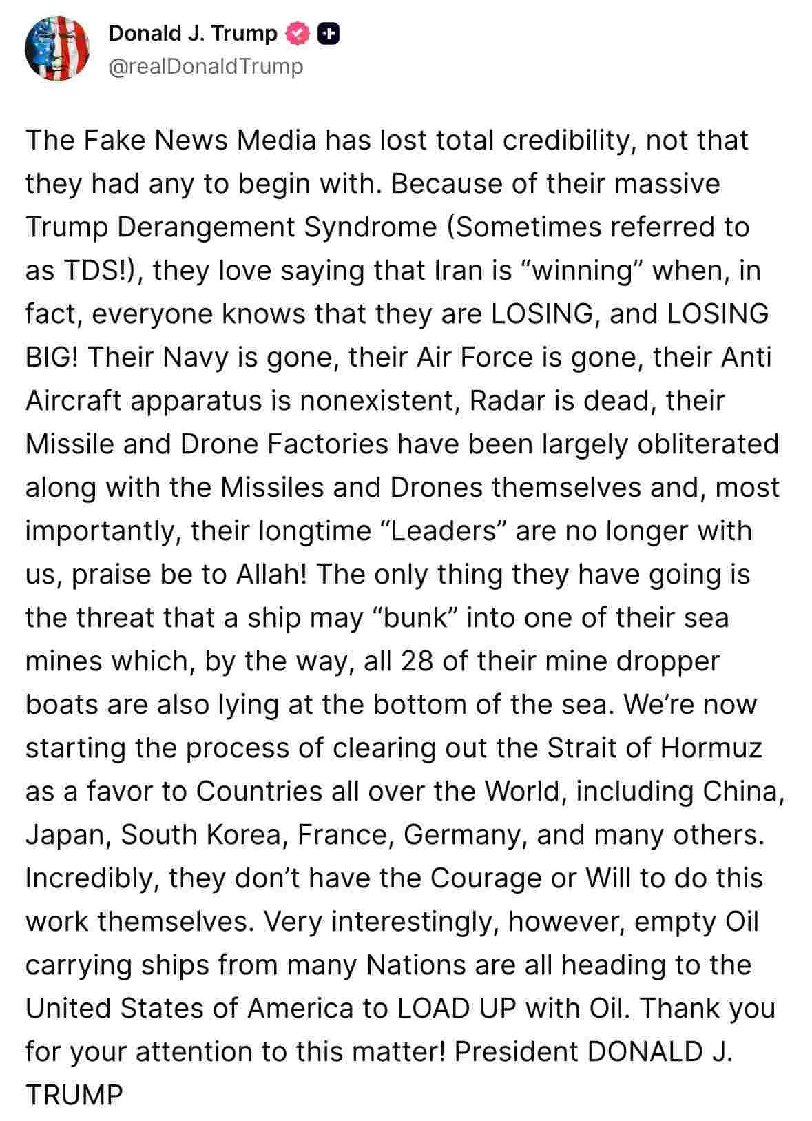 我々は現在、世界各国――中国、日本、韓国、フランス、ドイツなど――のために、ホルムズ海峡の掃海(安全確保)作業を開始している。驚くべきことに、彼ら自身にはそれをやる勇気も意思もない。