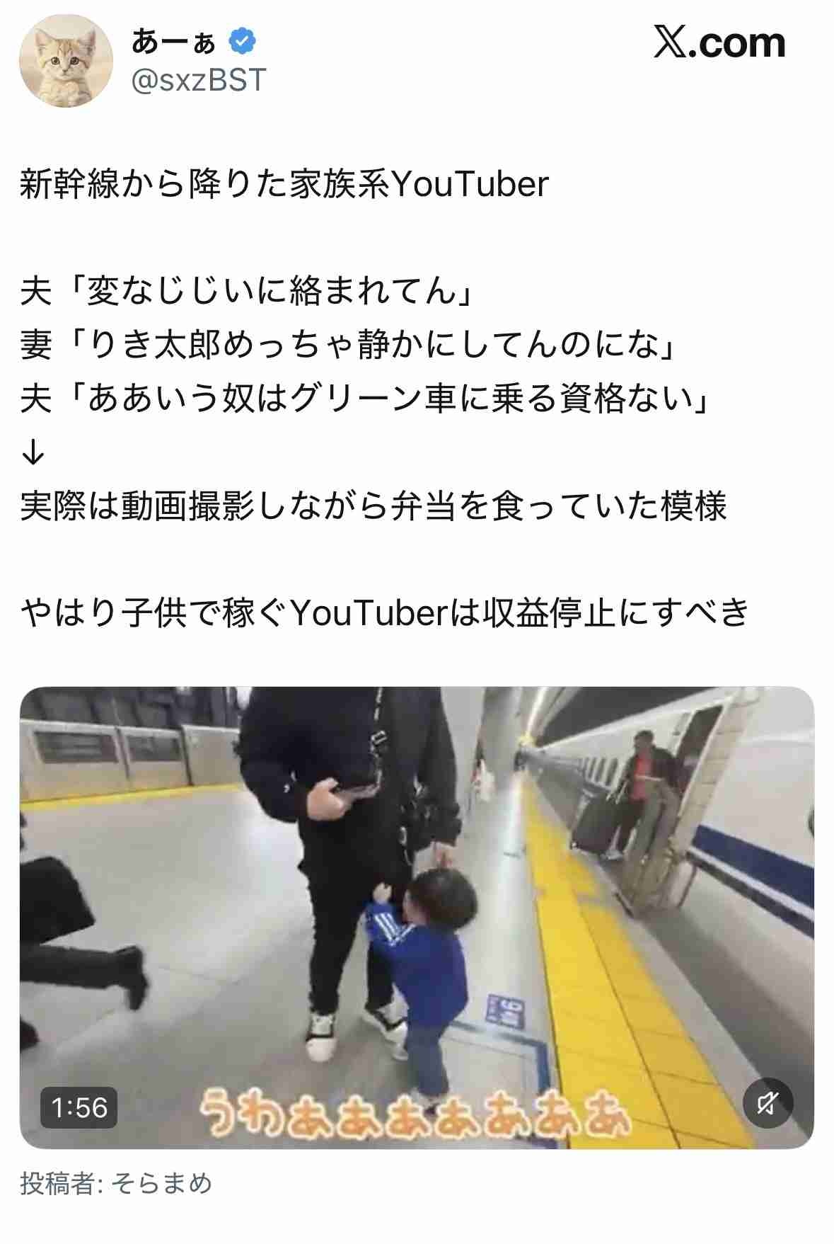 家族系ユーチュバー、大炎上中。「新幹線で変なジジイに絡まれた。」→実は車内で動画撮影してた