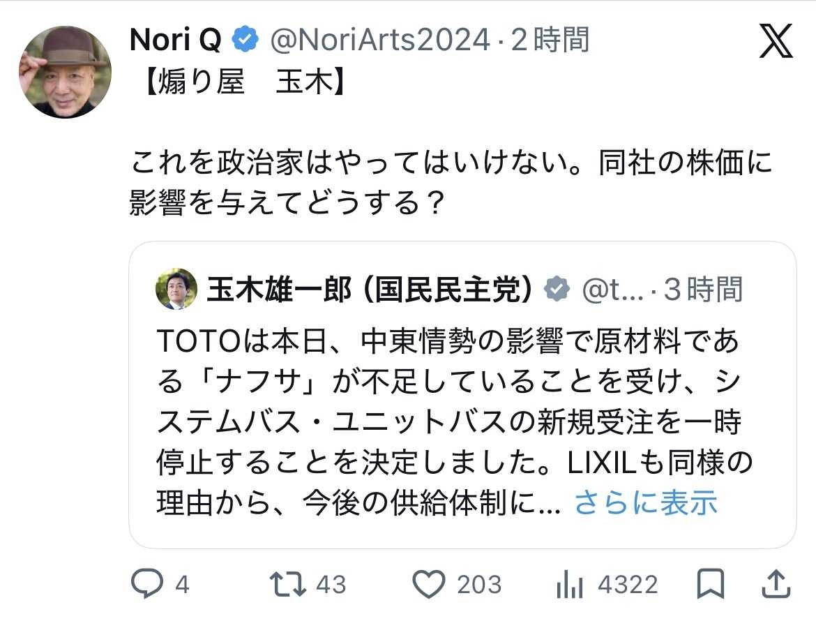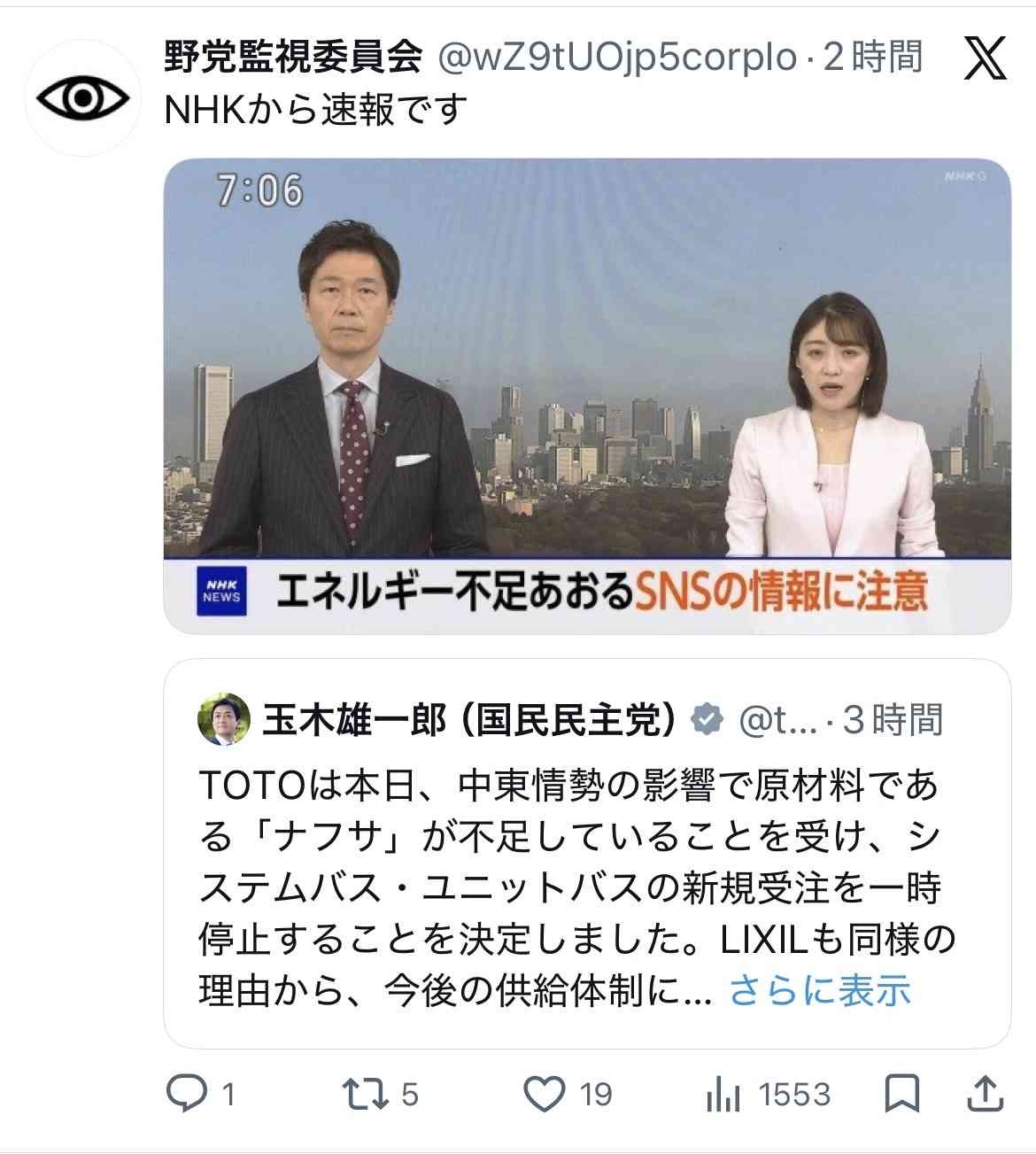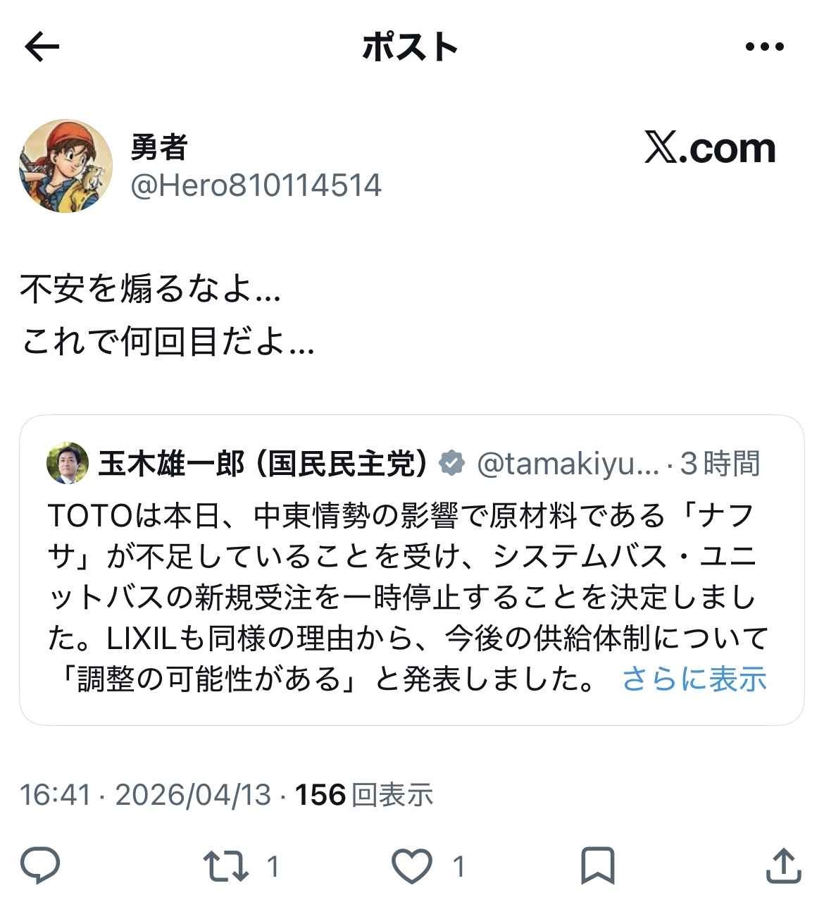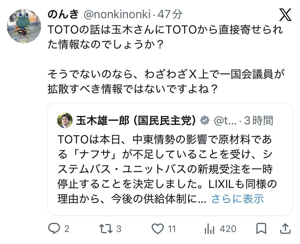 今回のTOTOなどのケースは会社自身が公に発表したものですが、その他の業種でも供給停止や価格急騰が発生しています。NHKの日曜討論で赤沢大臣はAIも使ってネット上の供給不足情報なども把握しているとおっしゃっておられましたので、直接寄せられた事実は政府に伝えるとともに、引き続きポストもしていきます。