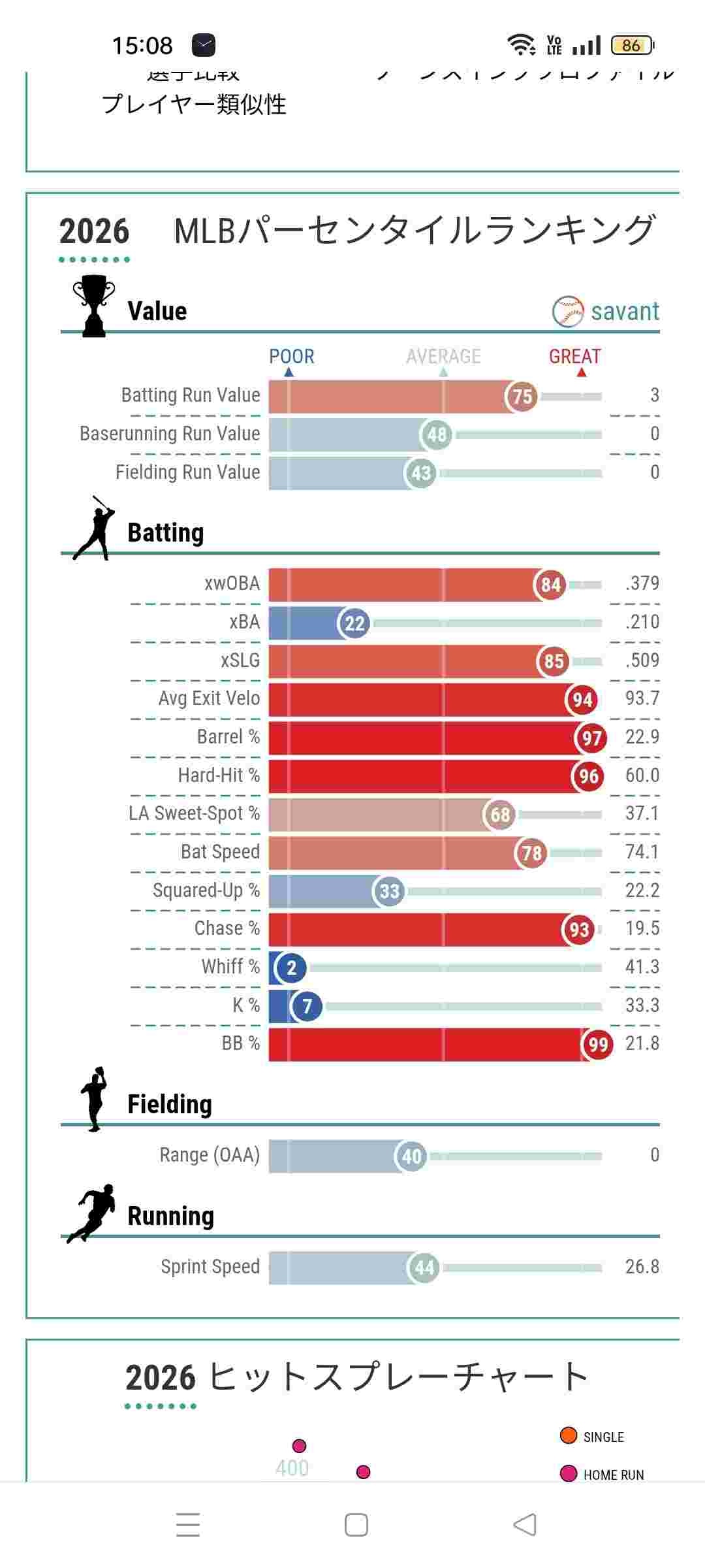 この成績をちゃっぴーに解析してもらったら、「超ハイリスク・ハイリターンの大砲型打者 ハマれば試合を壊す ダメな日は何もできない 投資的に例えるとグロース株でボラ高いやつ出来高と材料で一気に吹くが、下げも早い」って出たわw 最近投資の相談とかしてるから。