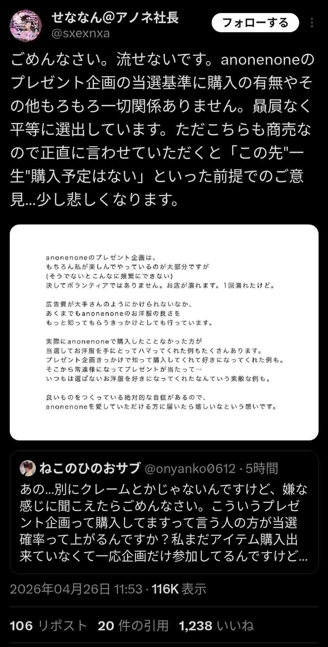 女「お前のとこのブランド一生買うつもりないけど購入者じゃないとプレゼントキャンペーン当たらん感じ?」→大炎上