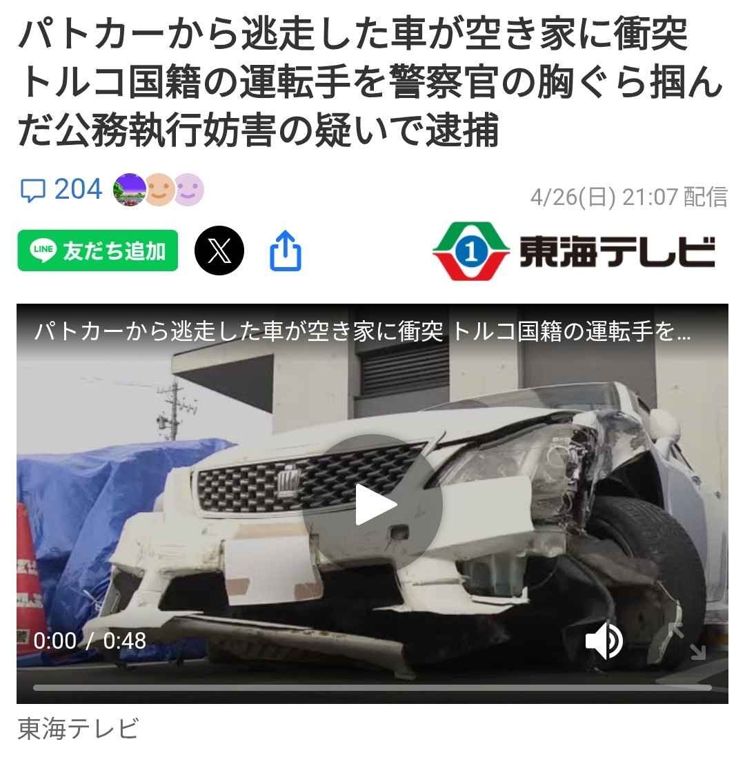 パトカーから逃走した車が空き家に衝突 トルコ国籍の運転手を警察官の胸ぐら掴んだ公務執行妨害の疑いで逮捕(東海テレビ) - Yahoo!ニュース愛知県津島市で26日早朝、パトカーから逃走した乗用車が、空き家に衝突する事故を起こしました。運転手のトルコ国籍の男が警察官への公務執行妨害の疑いで逮捕されました。 警察によりますと、26日午前news.yahoo.co.jp