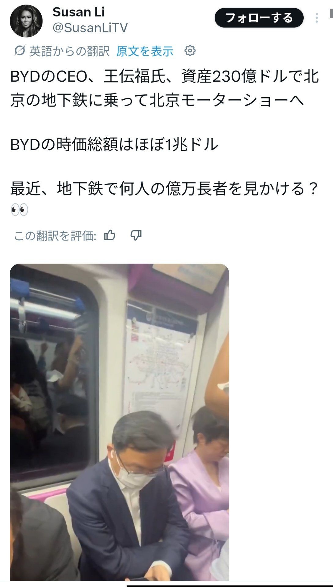 BYD創業者王伝福氏(総資産約4兆円)、北京モーターショーに向う地下鉄に1人で乗っているの発見される。ただのおっさん過ぎてオーラゼロw