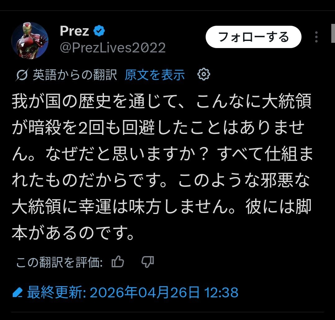 自作自演とかじゃなくてトランプが頻繁に命狙われるくらいヤバい大統領ってだけな気がするけどな