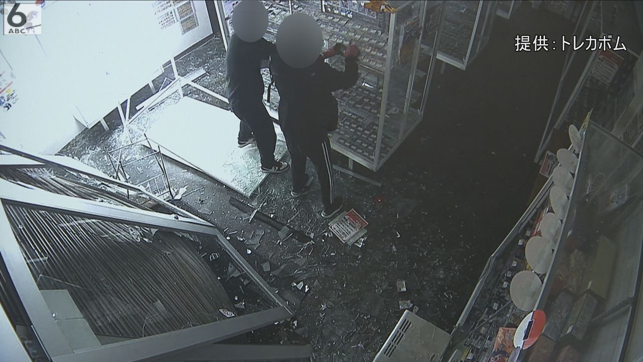 凄まじい音とともに飛び散るドアのガラス。ひしゃげたシャッターの隙間から2人組が侵入し、ショーケースのガラスを次々と破壊。陳列されたカードをカバンに詰め込んでいきます。