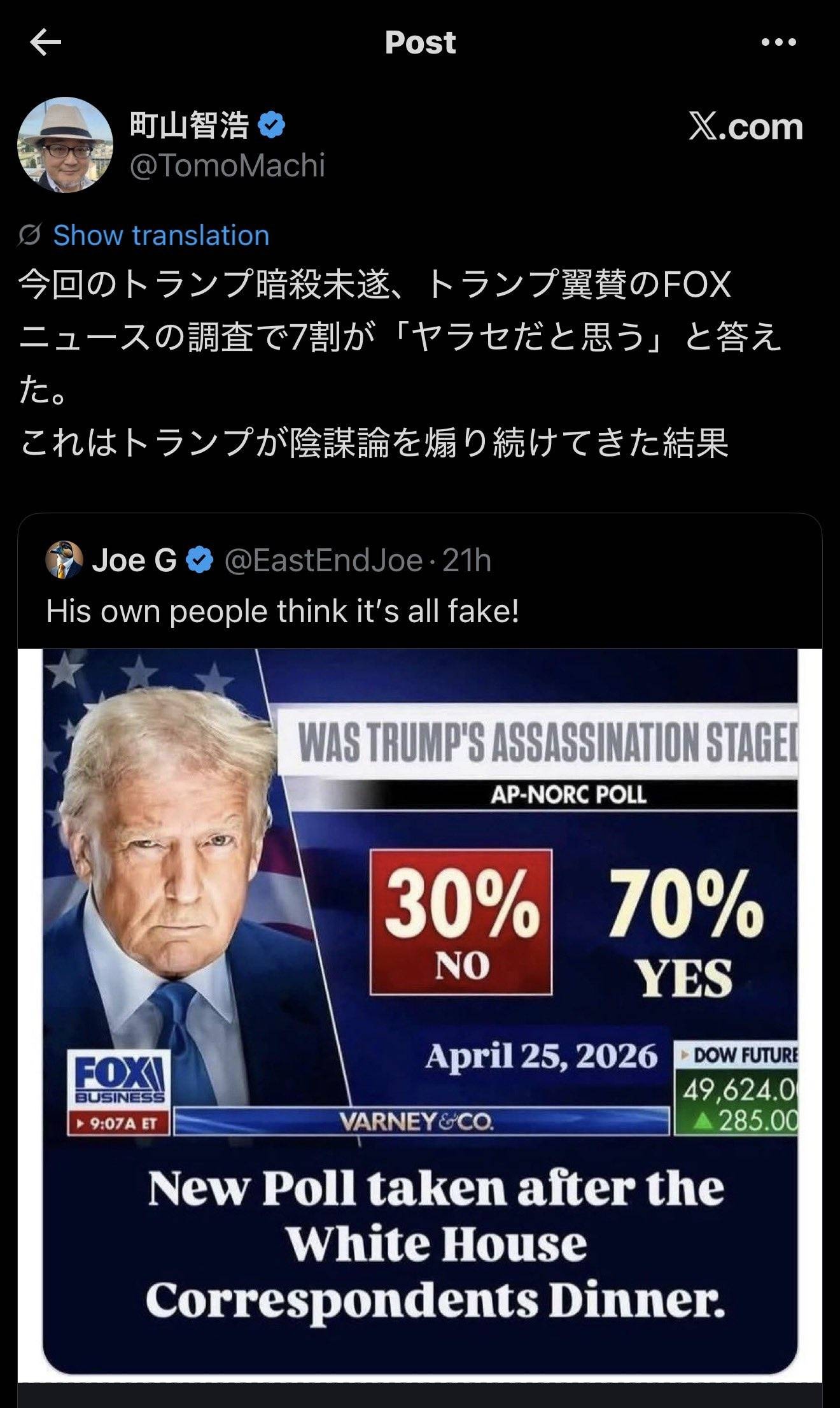 町山智浩「トランプ暗殺未遂をヤラセだと思っている国民は7割!FOXが報じた!」→フェイク画像、黙ってポスト削除