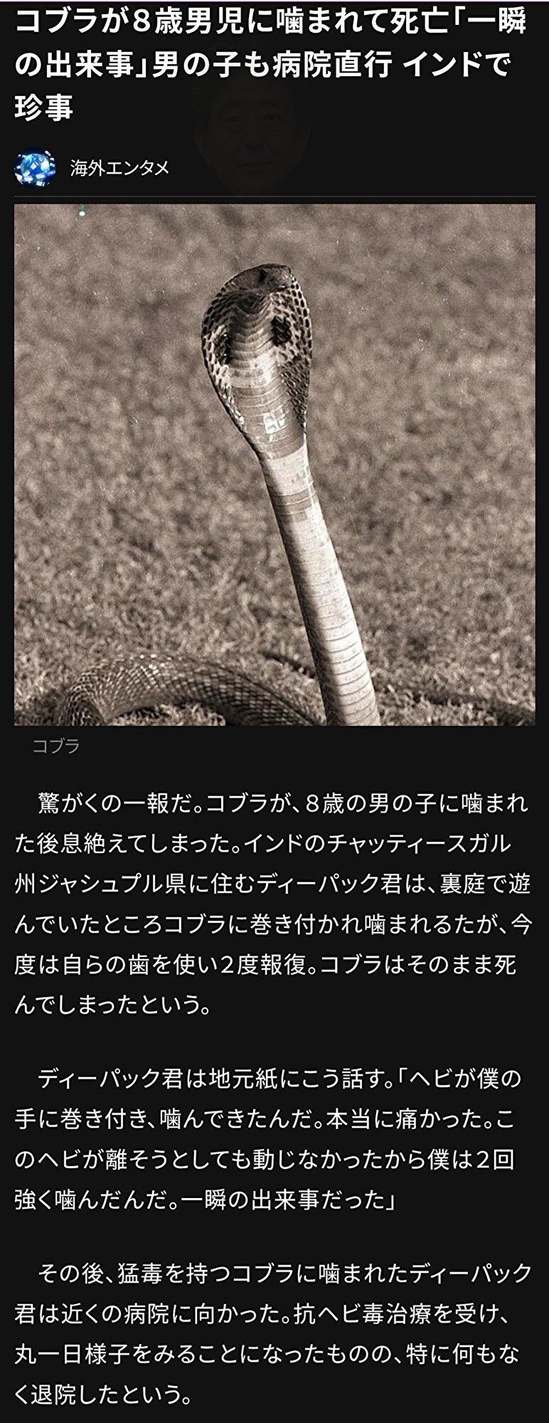 8歳男児がコブラに噛まれて死亡だと思ったら逆だった