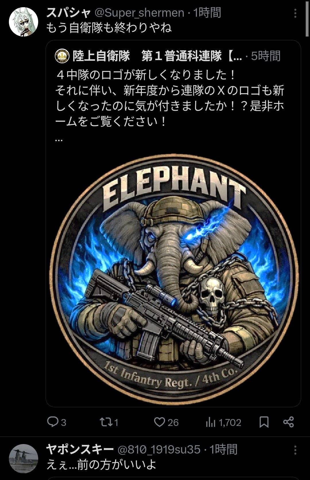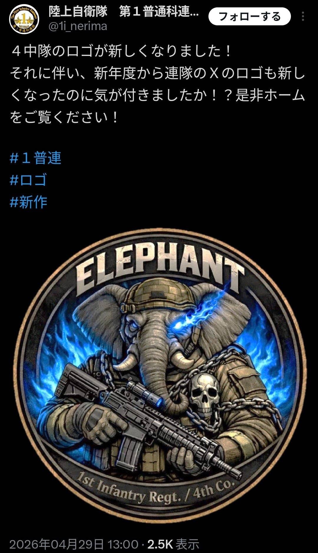 調べたら第四中隊は以前から象徴動物は象、色は青みたいね