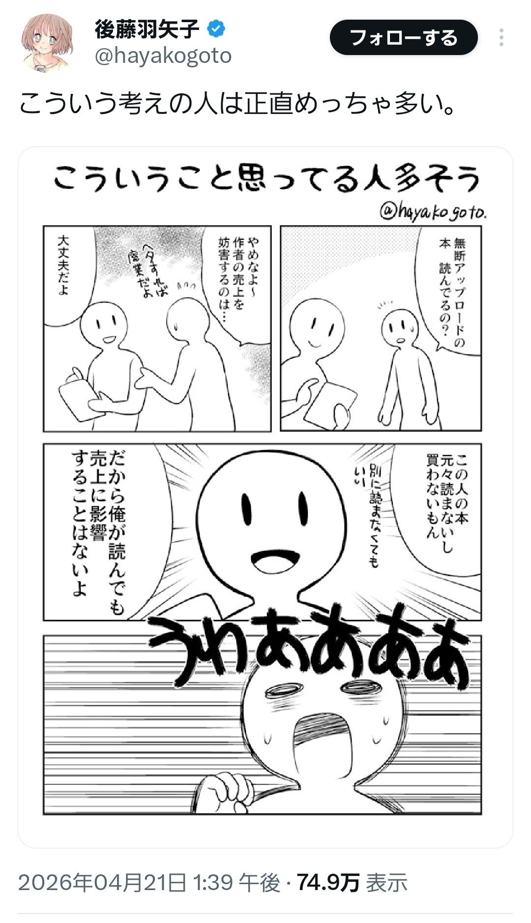 Xで勝手に漫画1ページ載せてる奴も違法やからな