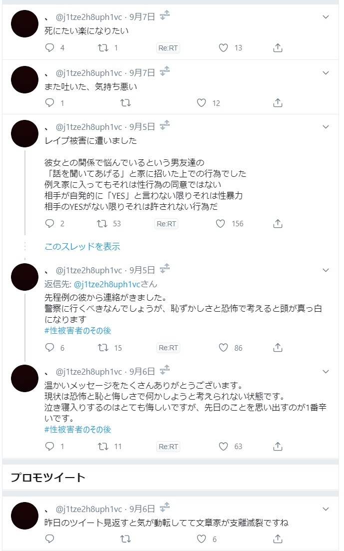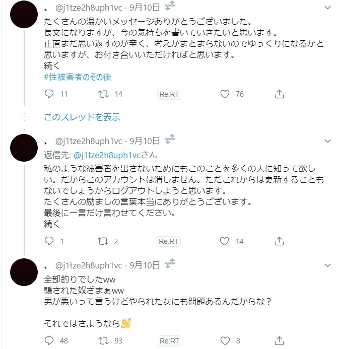 レイプ被害を苦に自殺を仄めかす釣りアカウントが登場、女さん爆釣れで余裕の勝利宣言へ
