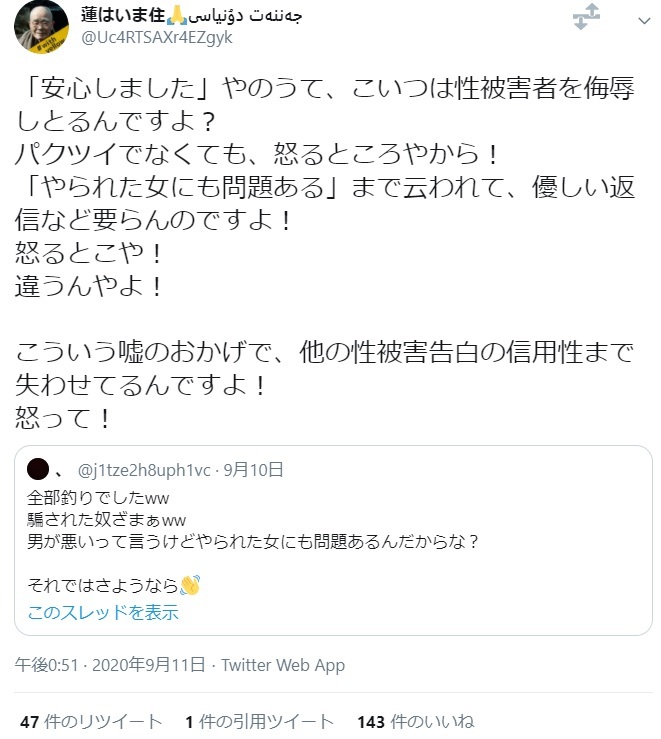 Twitter社にIP開示要求しろ - 45 : 2020/09/13(日) 01:13:50.01 ID:4+X9xOkAM