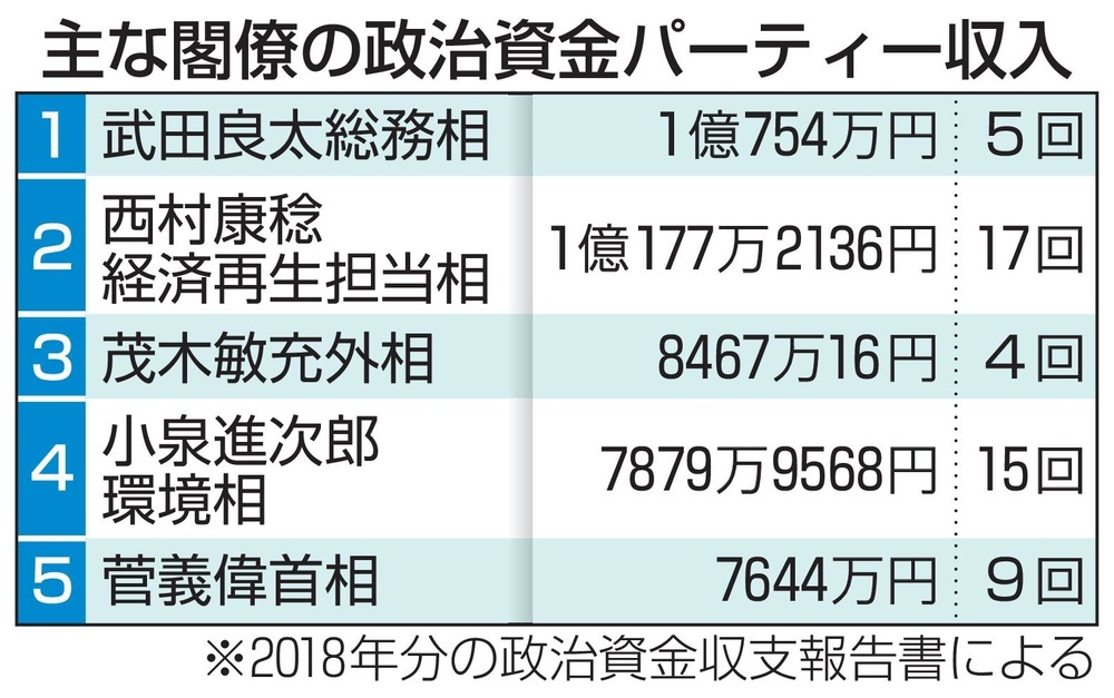 年間5万円超で収支報告書への記載義務がある通常の献金と異なり、パーティー券の購入者名は1回当たり20万円を超えないと義務がなく、大半は不明だ。閣僚ごとに見ると、武田良太総務相の収入が計1億754万円で最多。