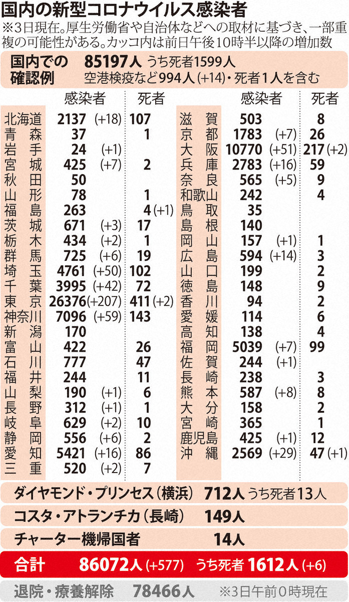 新型コロナウイルスの感染者は3日、国内で新たに577人が確認された。クルーズ船の乗客乗員らを合わせた感染者数は8万6072人、死者は6人増えて1612人となった。