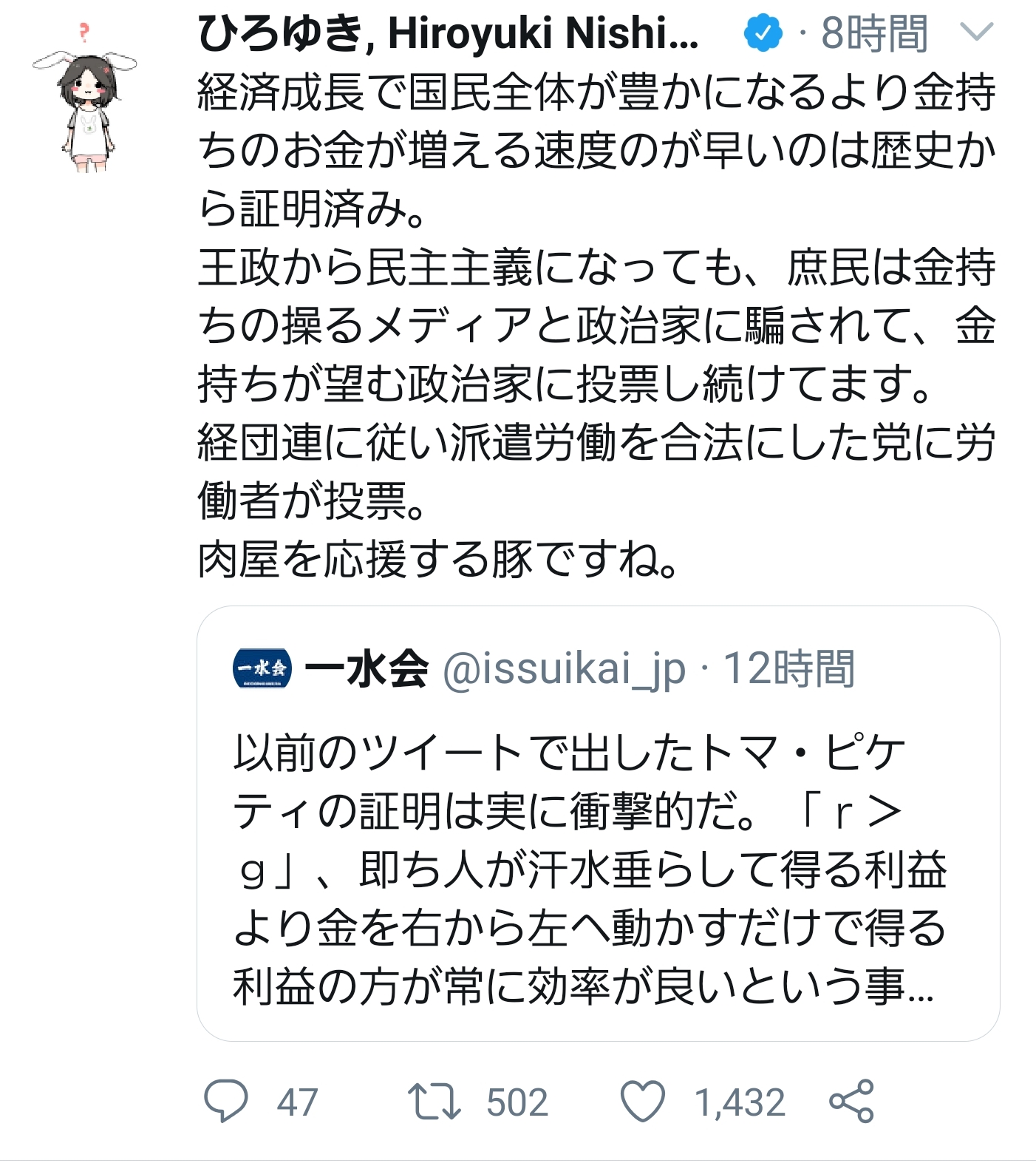 【悲報】ひろゆき「庶民は金持ちの操るメディアと政治家に騙されて自民党に投票。肉屋を応援する豚。」