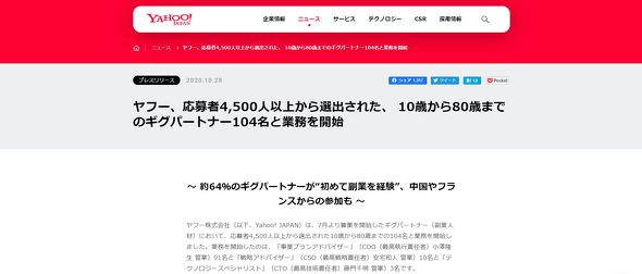 ヤフーは7月、他社で働きながらも副業として同社で働きたい人材をギグパートナーとして募集すると発表。インターネットサービスの企画立案を行う「戦略アドバイザー」や事業の戦略を立てる「事業プランアドバイザー」、メディアの企画立案や事業化を行う「新規メディアサービス企画」などのポジションに4500人以上の応募があったという。書類選考や面談を経て採用。ギグパートナーの雇用形態は業務委託で、主にテレワークで勤務する。年齢層は30代が42%、20代が29%、10代が10%、70代以上が3%。