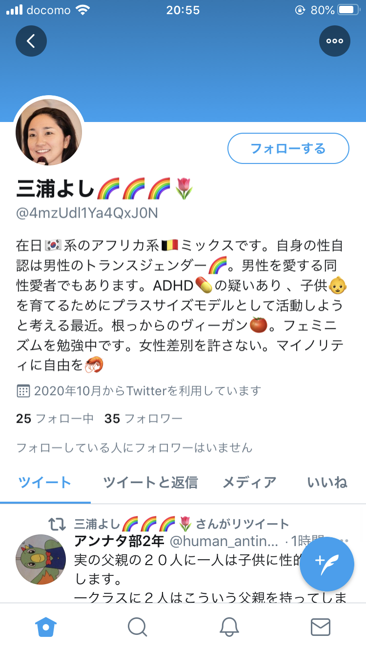 ツイフェミはどいつもデフォでこんなんばっかだろ - 10 : 2020/11/01(日) 21:12:12.71 ID:aa/H0pAz0
