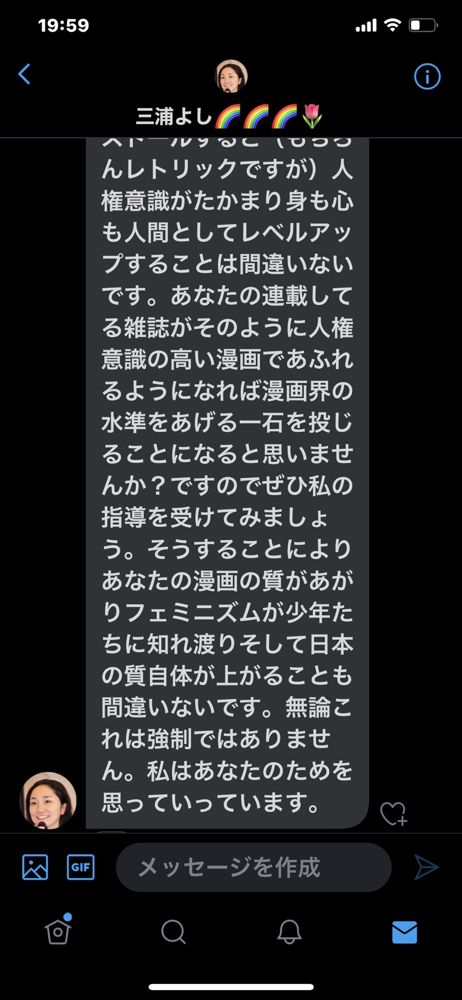 https://twitter.com/4mzUdl1Ya4QxJ0N/status/1321257325701656576私はマーケティングというよりもあなたの漫画にフェミニズムをインストールする手伝いをしようと言っているのです。無論、これは強制ではありません。あなたの漫画にもっと男女平等の女性をモノ化しない健全な思想を入れ込むとあなたの信奉する「売上」も伸びると思いますよ。