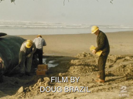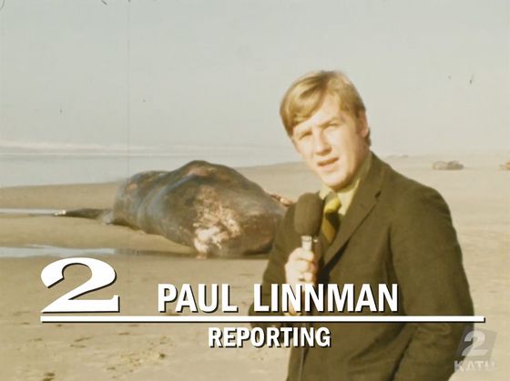 漂着したクジラを前にマイクを持っているのは、当時KATUのニュースリポーターを務めていたポール・リンマン氏。