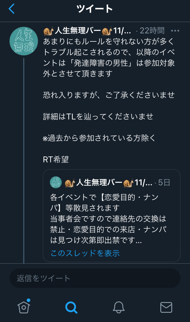 人生無理バー「発達障害の男性は参加対象外とさせていただきます」