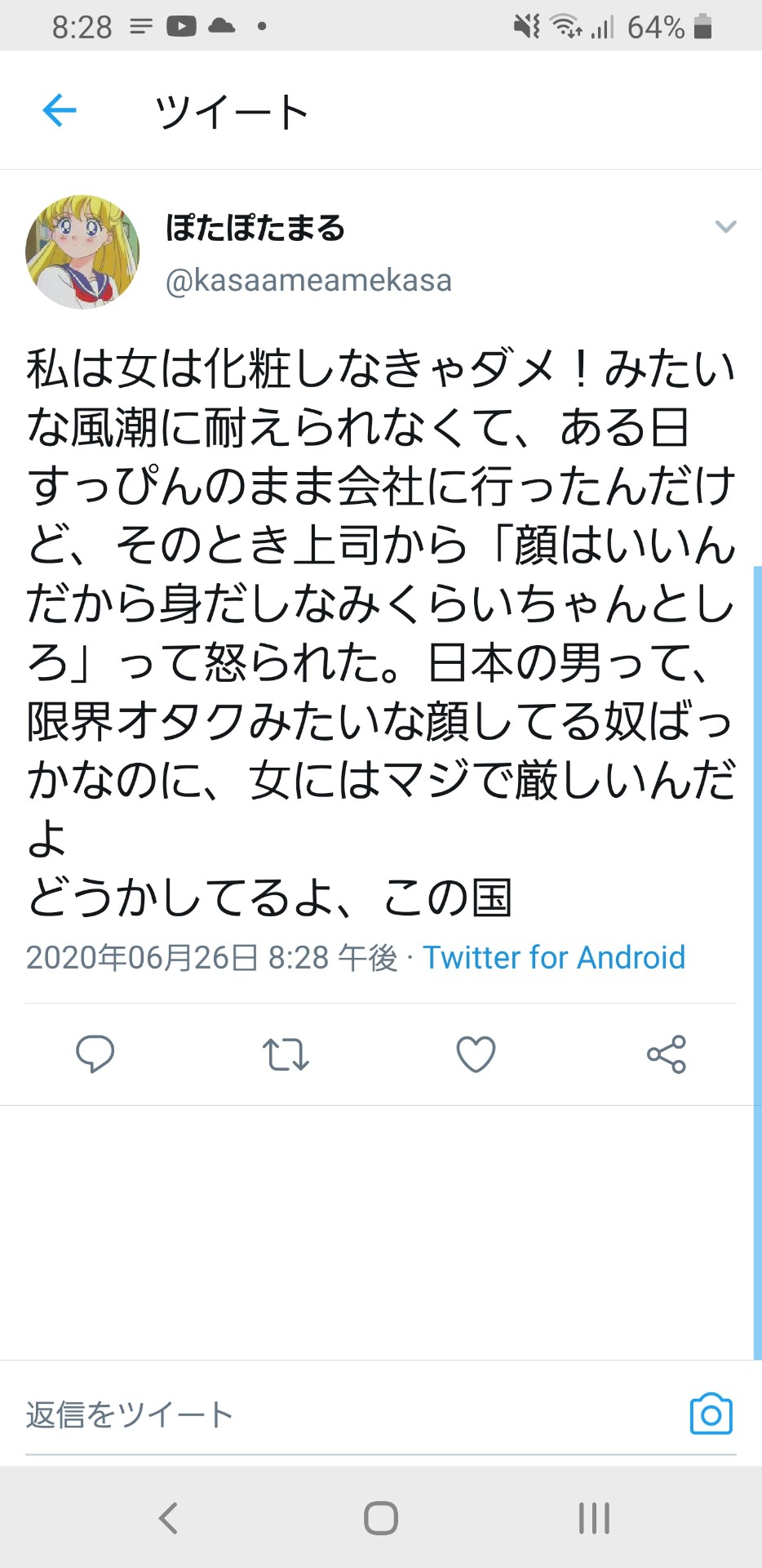 【悲報】フェミがすっぴんで会社に行き「顔が良いんだから化粧くらいしろ」と怒られる
