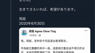 アグネス・チョウさん「本日で活動終了です」 立憲枝野「日本の国際社会の非力をお詫び申し上げます」