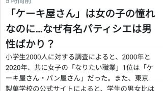 なんJ 文春「女の子は小さい頃ケーキ屋さんになりたいと言うのに実際パティシエは男ばかり。なんでやろな笑」