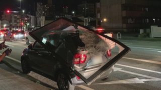 窓枠を車にひっかけながら暗闇走り抜ける。店舗に突っ込んだ車カス。3km走って車置いて逃走