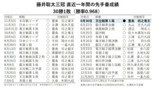 【驚愕】藤井聡太三冠、直近1年間の先手番成績30勝1敗(勝率0.968)