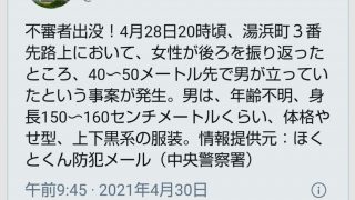 ニュー速+ 【不審者情報】女性が後ろを振り返ったところ、40~50メートル先で男が立っていたという事案が発生