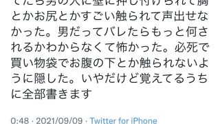 嫌儲 まんさん「痴漢に遭遇しました…怖くて涙が止まりません🥲」