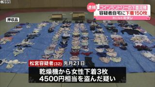 ニュー速+ 【三重】コインランドリーで乾燥機に頭を突っ込み…50代女性の下着3枚盗んだ疑い 会社員男(32)逮捕 自宅から150枚押収 ※陳列画像