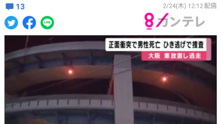 ニュー速 西成のめがね橋でテンプラナンバーの車カスが死亡ひき逃げ。対向車線はみ出し正面衝突。車を置いて逃亡
