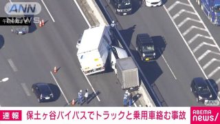 ニュー速+ 【ジーク】保土ケ谷バイパスで4台が次々衝突 トラックが乗用車に乗り上げる…