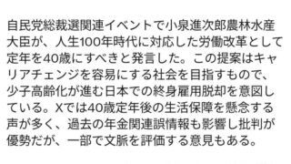 小泉進次郎が労働改革として「定年40歳」を提唱して大炎上中…マジで終ってんだろこいつ