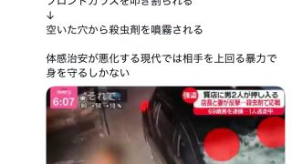【動画】日本の治安、限界突破…強盗犯の車のフロントガラスを粉々に叩き割り殺虫剤で攻撃