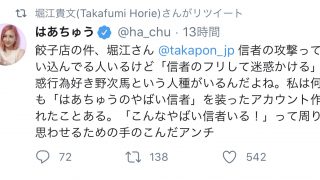 嫌儲 【悲報】はあちゅう「餃子店の件は、堀江アンチが堀江信者のフリしてお店に迷惑かけてるだけ」