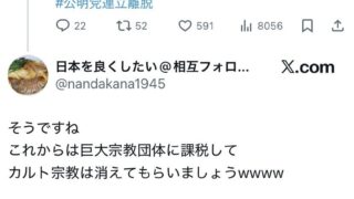 高市支持者、公明党にブチギレ「宗教法人に課税しろ💢」