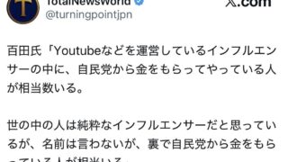 百田尚樹「Youtubeなどを運営しているインフルエンサーの中に、自民党から金をもらってやっている人が相当数いる」